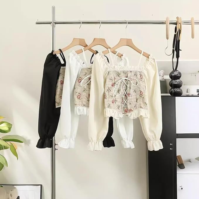 The off shoulder design enhances femininity and offers a stylish, trendy look. The lace-up front corset detail and puff sleeves add a playful yet sophisticated flair, giving it a unique vintage aesthetic. The ruffled crop blouse design creates a flattering silhouette that highlights the waist, making it a perfect match for high-waist skirts, jeans, or shorts.