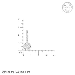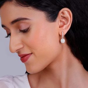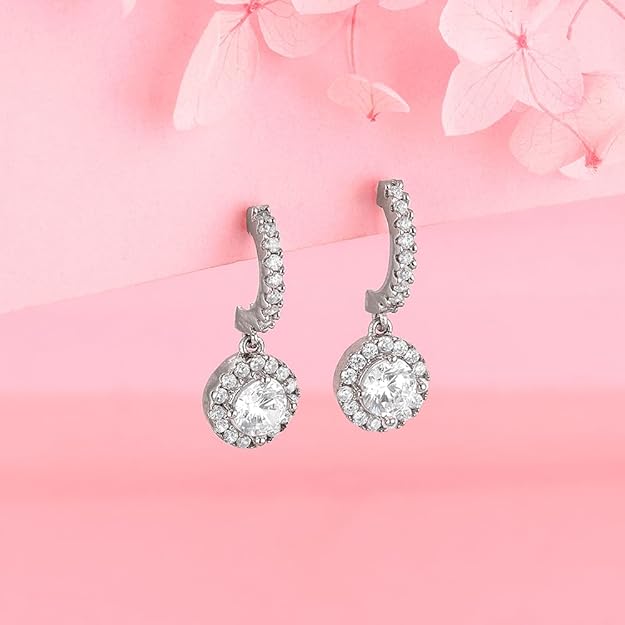 Designed with sophistication in mind, these silver stud earrings feature a circular motif dropping from a half hoop, both studded with cubic zirconia. The carefully placed zircons catch the light with every movement, adding a touch of sparkle to your look. Whether worn for a casual outing or a grand celebration, these silver stud earrings complement any outfit and elevate your style effortlessly. The intricate detailing showcases meticulous craftsmanship, making them stand out as a statement accessory.